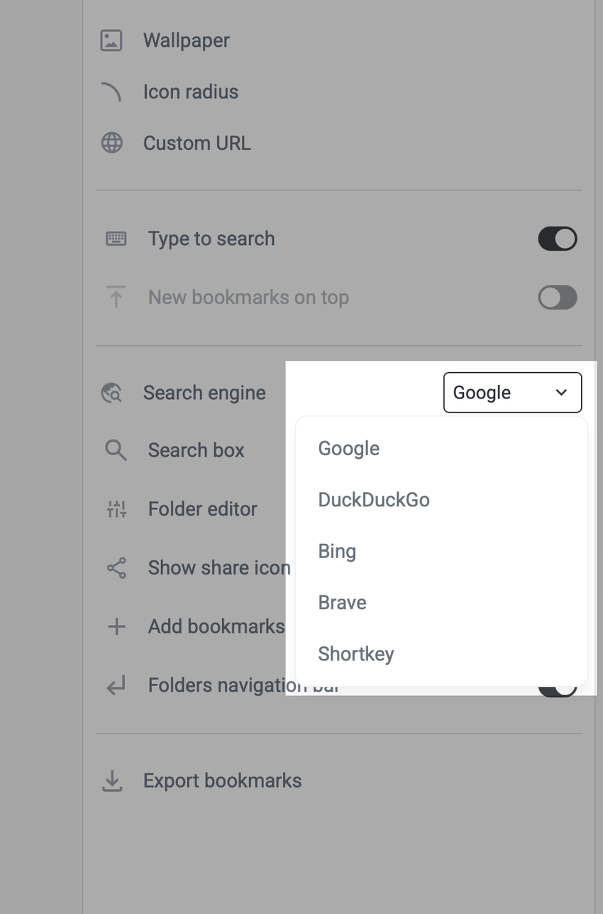 When you type in the search field, you'll always see an "Search with ..." button. Clicking on this button lets you choose your preferred search engine before launching the search. This feature is part of the Bookmer browser extension, which replaces the new tab. It allows you to interact with your bookmarks while also browsing with your chosen search engine.